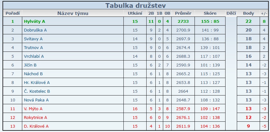Vč Divize - tabulka družstev po odehrání 16.kola soutěže