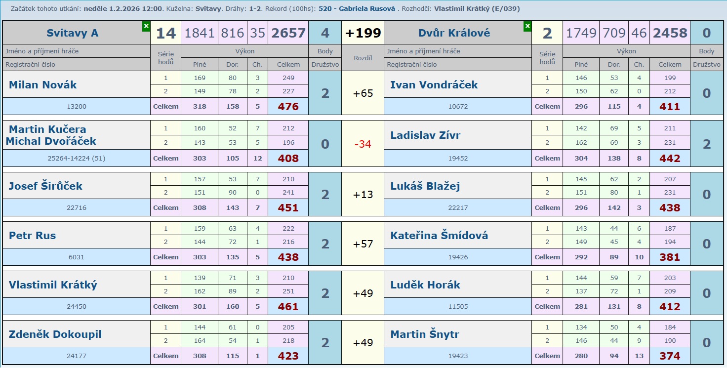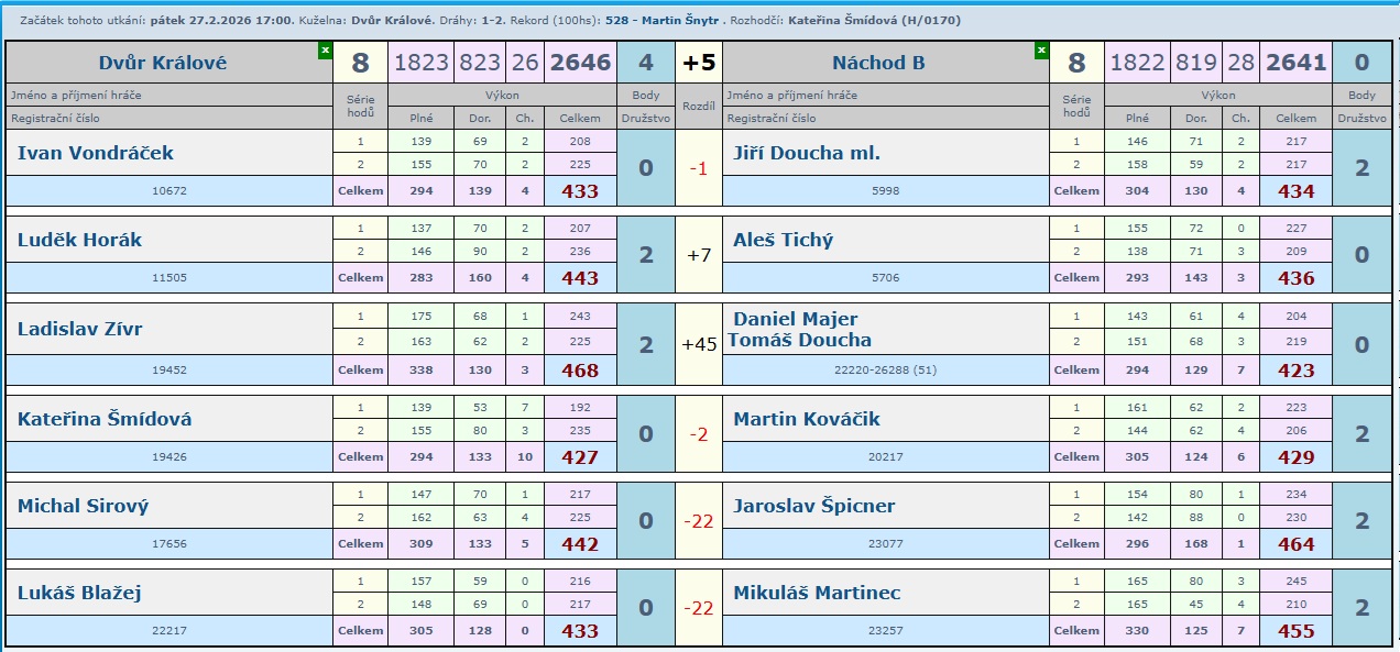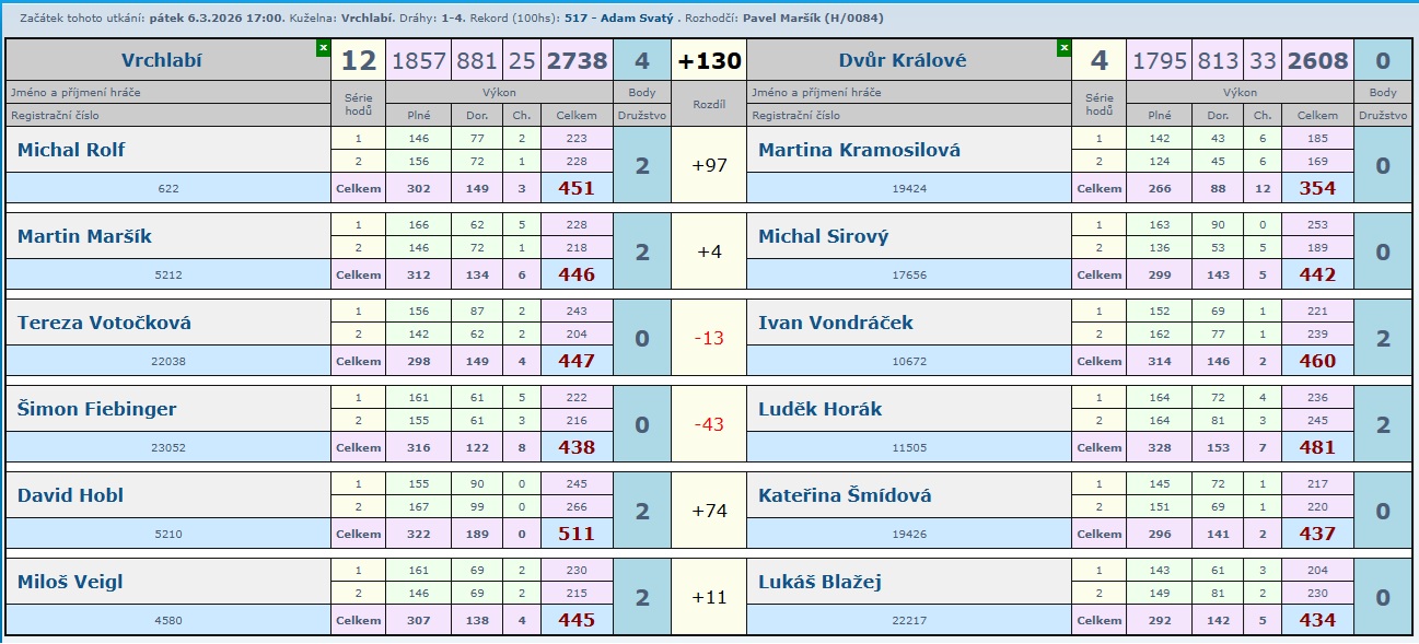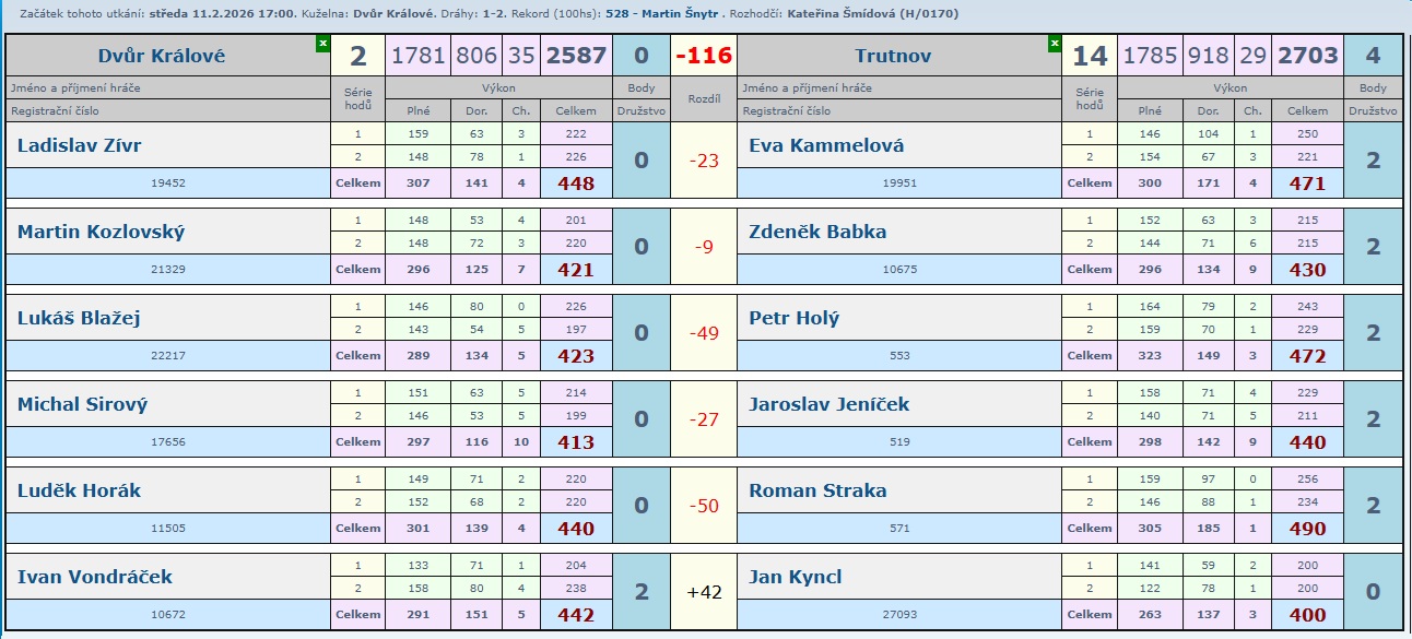 Ve čtvrtek 20-11-2025 jsme opět odehráli napínavý zápas s hosty z Vrchlabí. První dvě domácí dvojice prohráli, střed se snažil ztrátu snížit a úkolem poslední dvojice bylo zvítězit nad svými soupeři. Bohužel se to povedlo jen "dotahovákovi", ale nestačilo to na celkovou ztrátu a tak jsme nakonec opět darovali body hostů.