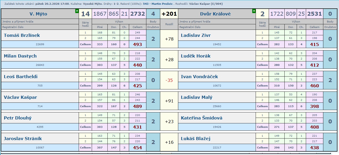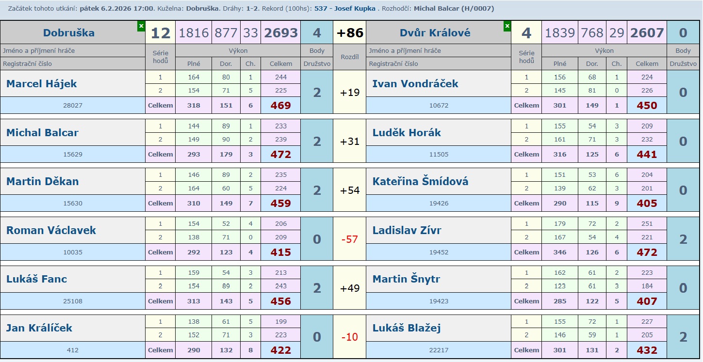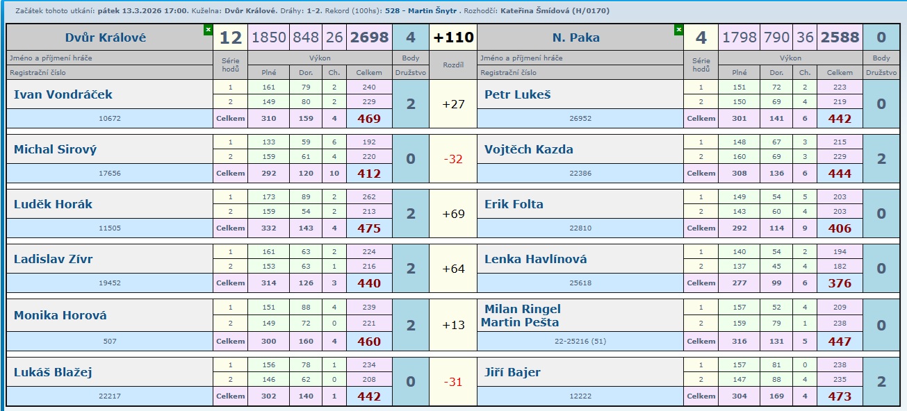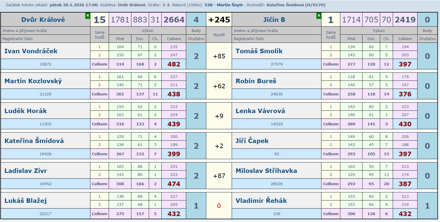 Ve čtvrtek 20-11-2025 jsme opět odehráli napínavý zápas s hosty z Vrchlabí. První dvě domácí dvojice prohráli, střed se snažil ztrátu snížit a úkolem poslední dvojice bylo zvítězit nad svými soupeři. Bohužel se to povedlo jen "dotahovákovi", ale nestačilo to na celkovou ztrátu a tak jsme nakonec opět darovali body hostů.