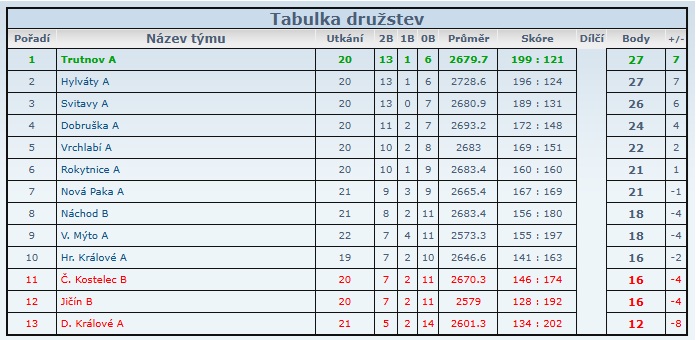 Vč Divize - tabulka družstev po odehrání 22.kola soutěže