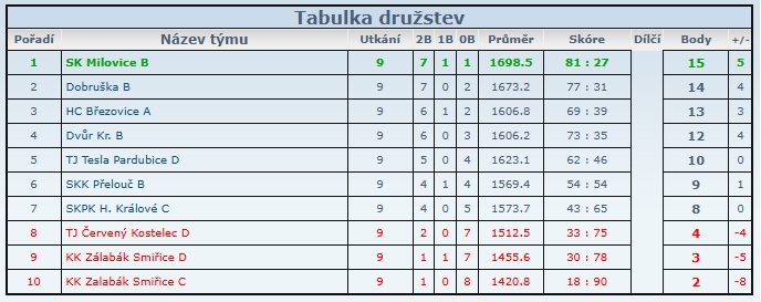 Vč soutěž skupina B - tabulka družstev po odehrání 9.kola soutěže